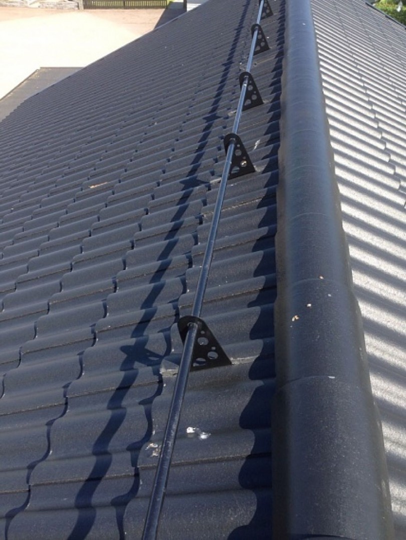 På en del tak behöver vi montera ett s.k. nockräcke innan en takbehandling kan utföras. Det beror på takhöjd, taklutning och undertakskonstruktion. Vi behöver detta för att kunna arbeta säkert och kunna förankra våra säkerhetslinor på ett säkert sätt. Vår egen snickare tar hand om denna installation.